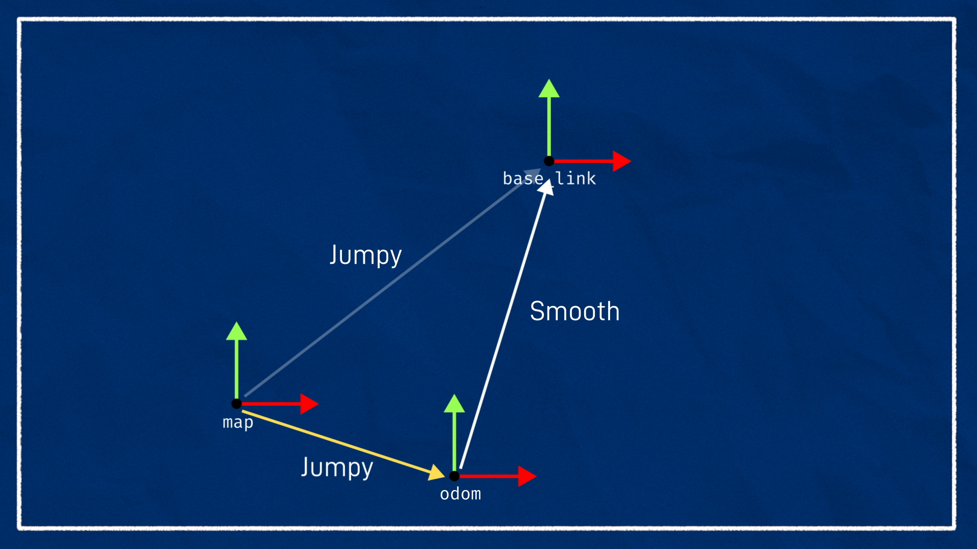 Let’s say we now introduce a system that can correct this drift, like GPS or SLAM. Because these systems directly measure the robot position, if we use them to update the odom-> base_link transform, this could cause the robot to jump around. In many cases this is not a problem, but some algorithms may not like it.