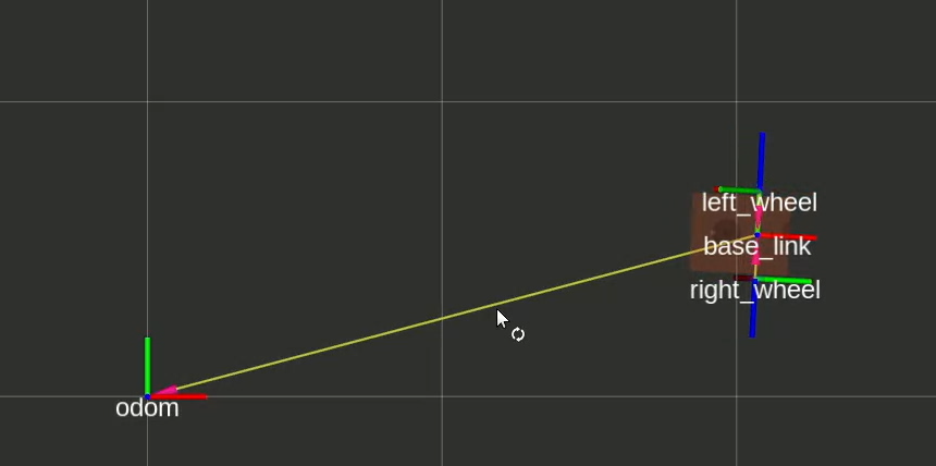 Up until this point, when we’ve driven the robot around, we’ve set our fixed frame in RViz to something called odom. In the absence of any other reference, odom represents our world origin. The transform from odom to base_link is calculated by the differential drive controller. When our robot first starts up, it’s at (0,0), the two frames are on top of each other. As the robot drives around, base_link will move compared to odom.