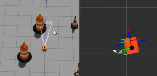 I’ll just swap the camera view to top-down-ortho so that there’s no perspective error, and if l do a big loop around, you’ll see that as I approach my starting position again there are two coordinate frames. If we show names, you can see one is the map, and the other is odom, so this is showing me how much the odom origin has drifted compared to the map origin. And as I get back to where I started, hopefully our map can tell us exactly where we are!