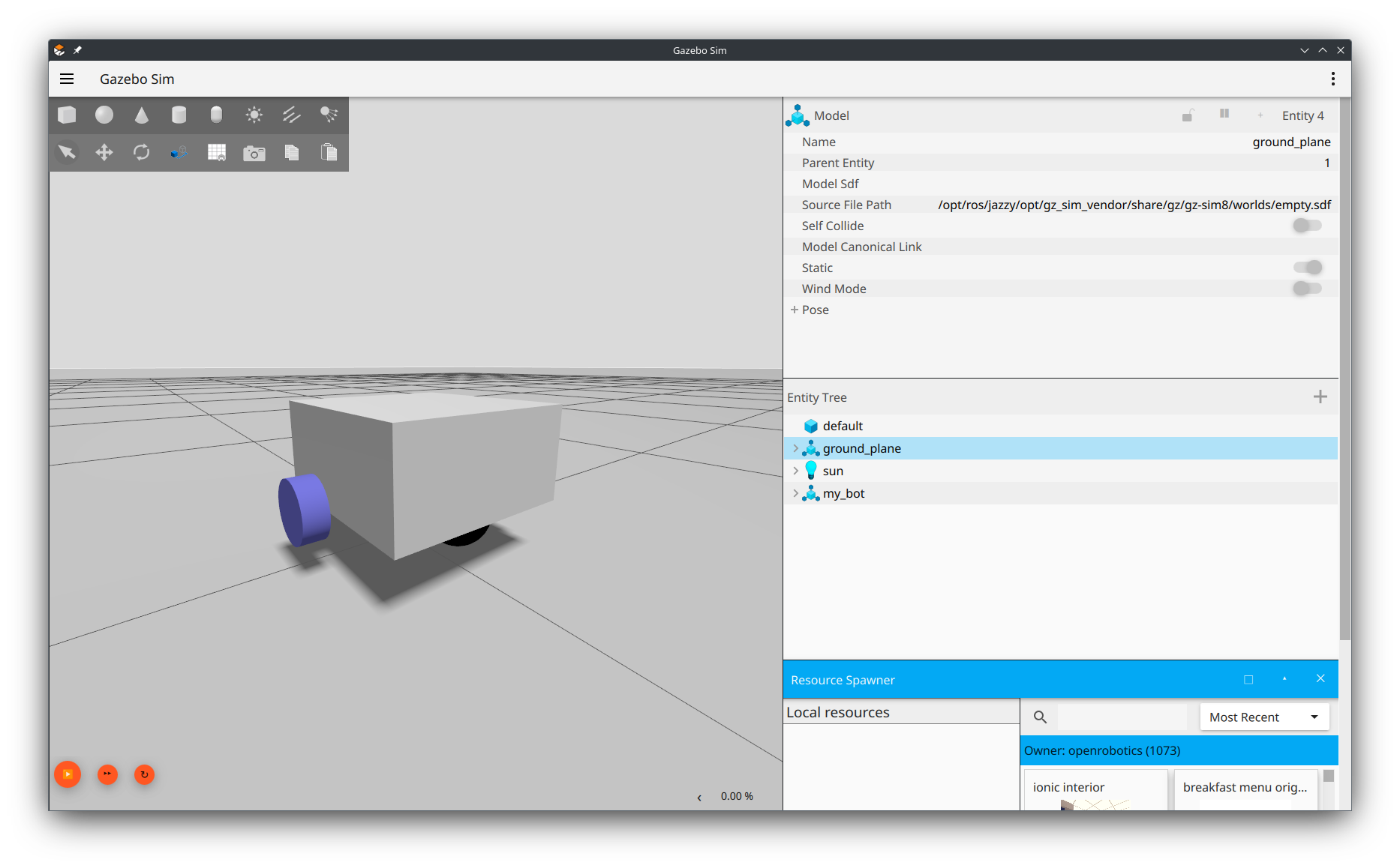 Let's start by spawning our robot into Gazebo as-is, and we'll recap the important parts of the Gazebo overview tutorial while we're at it.
